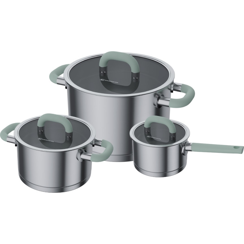 Набор Takara Set — это идеальное решение для вашей кухни! В комплект входят: ковш с антипригарным керамическим покрытием на 2 л, кастрюли на 3,8 л и 6,7 л. Все предметы имеют многослойное капсулированное дно: конструкция, состоящая из нескольких слоев различных металлов, которые обеспечивают равномерное распределение тепла по всей поверхности посуды. Внутренний и внешний слои сделан из нержавеющей стали для прочности и устойчивости к коррозии, а между ними прослойка из сплава, обладающий высокой теплопроводностью. Это позволяет быстро и равномерно нагревать пищу, предотвращая пригорание и обеспечивая экономию энергии.