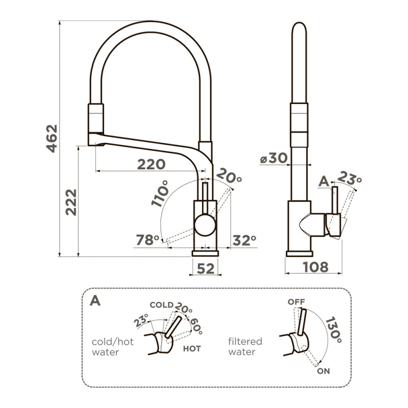 Тип: Для установки под окном, отдельный рычаг регулировки, вытяжной шланг до 400 мм, Multi - единый рычаг управления для горячей, холодной и питьевой воды